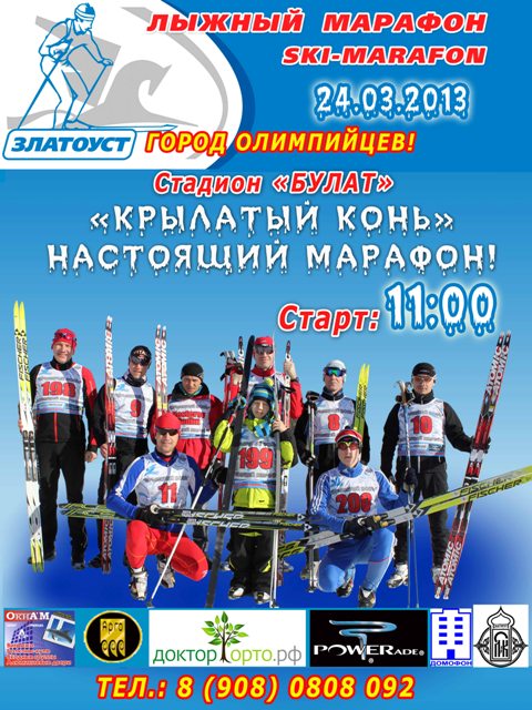 Дорогие любители лыжных гонок! 24 марта в Златоусте состоится традиционный лыжный марафон - "Крылатый конь"! Приглашаем всех желающих принять участие в нашем празднике! Красивые номера и кружки достанутся на память каждому участнику закончившему дистанцию! Оргкомитет надеется в этом году принять до 200 участников! Положение о соревнованиях